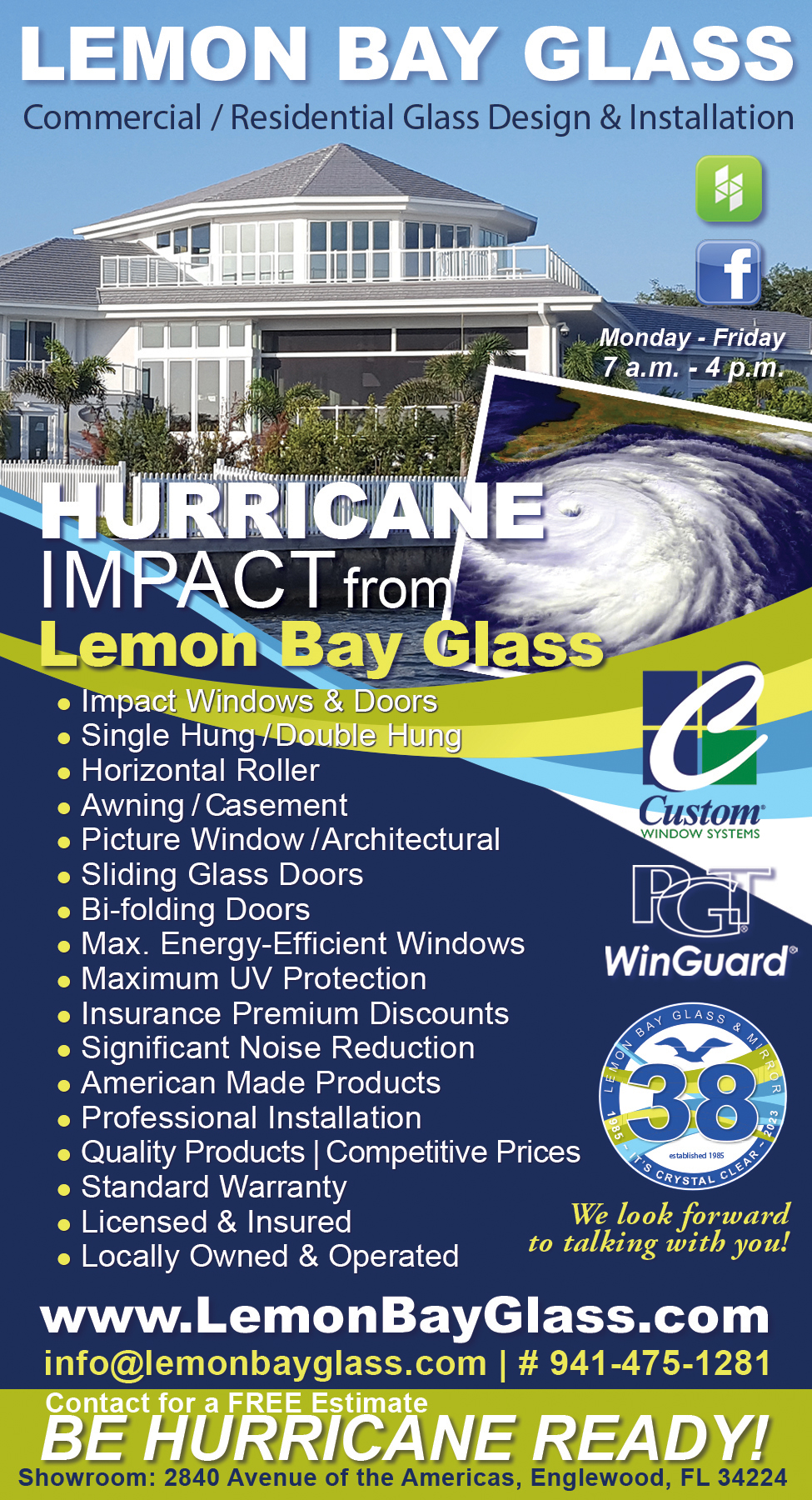 The focus of Lemon Bay Glass has always been on providing the customer with the highest level of service and delivering satisfaction beyond expectations. Contact us today for extended information on various window and door products for your selection. Our team, continuing with a 35-year tradition, is ready to service your glass & mirror needs.